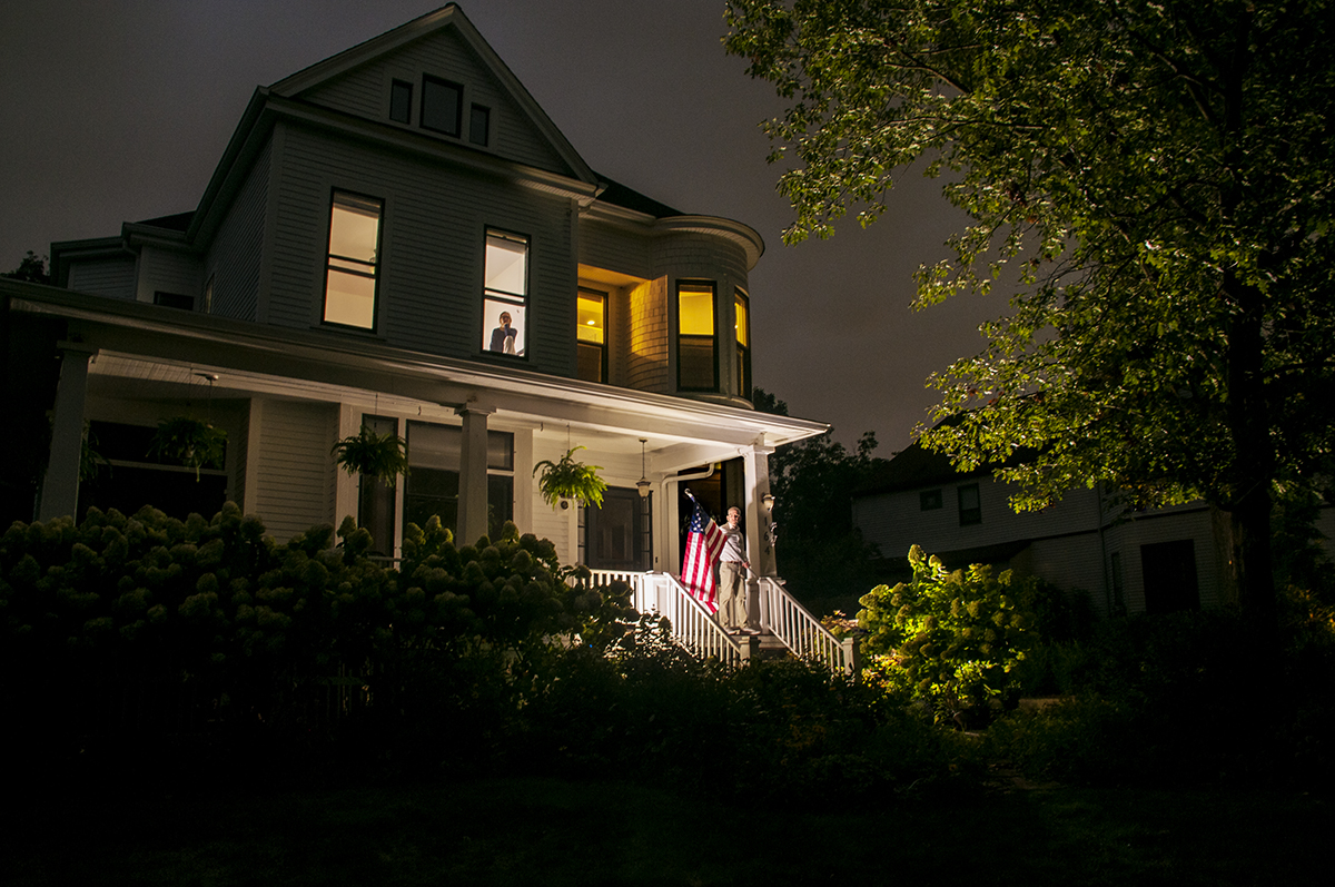 With rain, just put an umbrella over the camera and you’re good. However, shooting in low light with long exposures, wind is a nightmare because if anything in the image is moving, it will be blurry. This was the shoot where I realized that. More specifically, if you’re doing a long exposure photograph, you do not want a flag in the image. That was a problem here because the whole point of the photo was that Charley Grant was going to be removing his American flag for the evening while his wife, Mollie, was upstairs in the house.